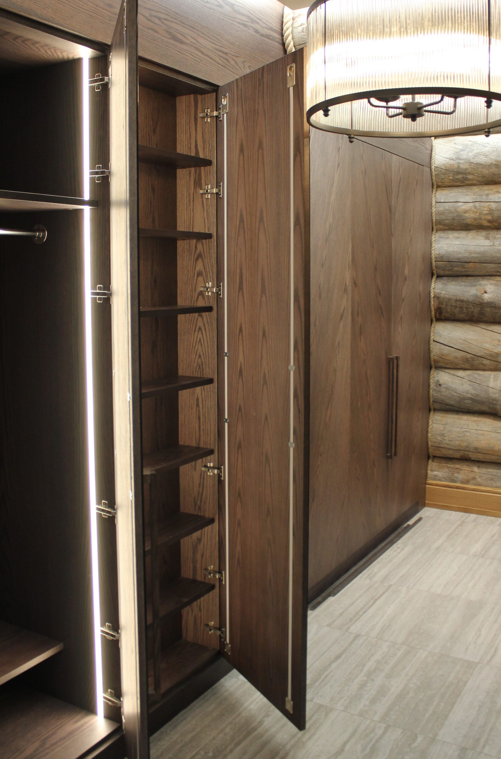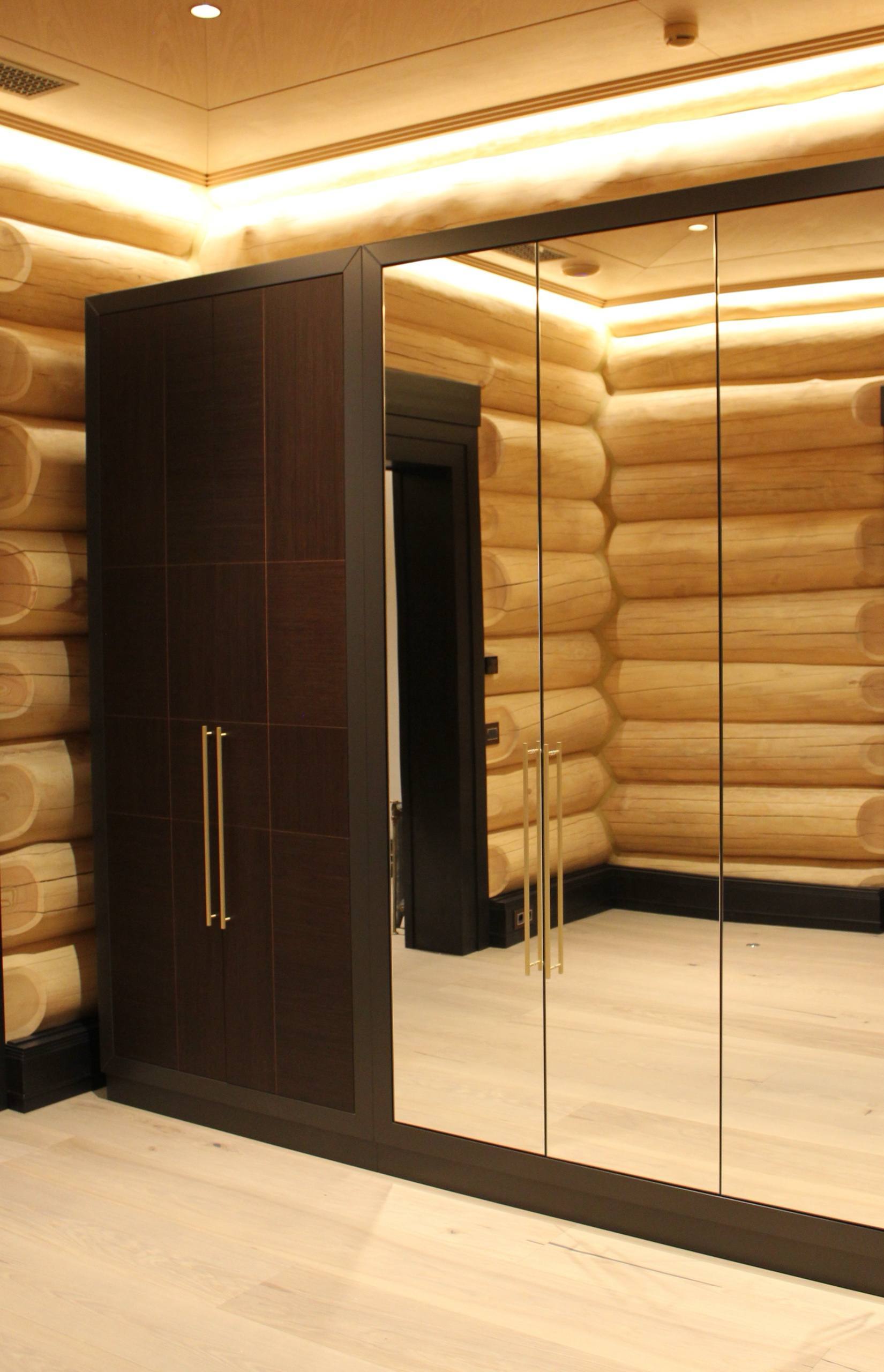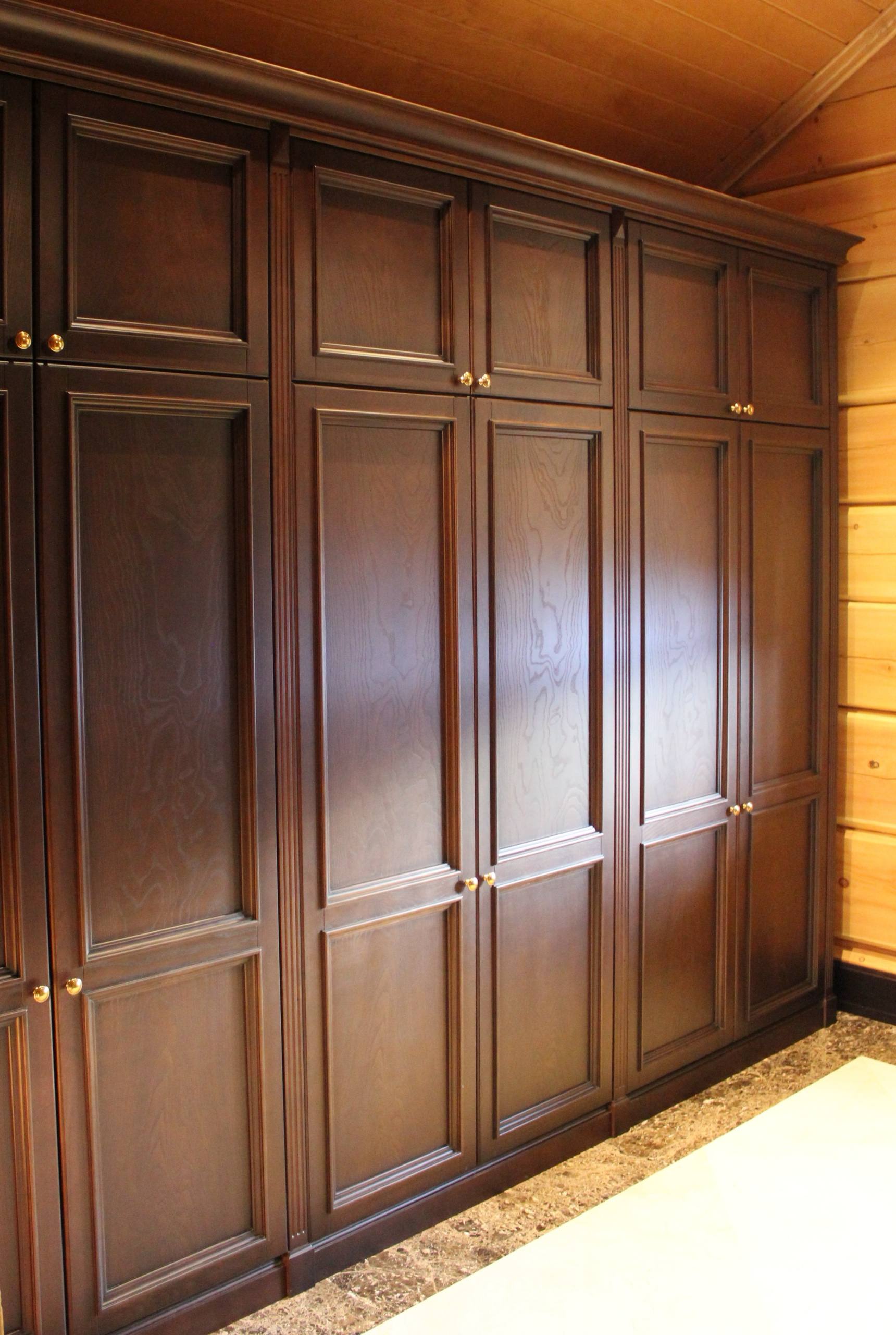 Для гардеробных мы используем дерево дуба, ореха, лиственницы, бука, ясеня, кедра и тика и применяем элементы натурального массива для придания уникальных форм повышенной сложности на фасадах шкафов.