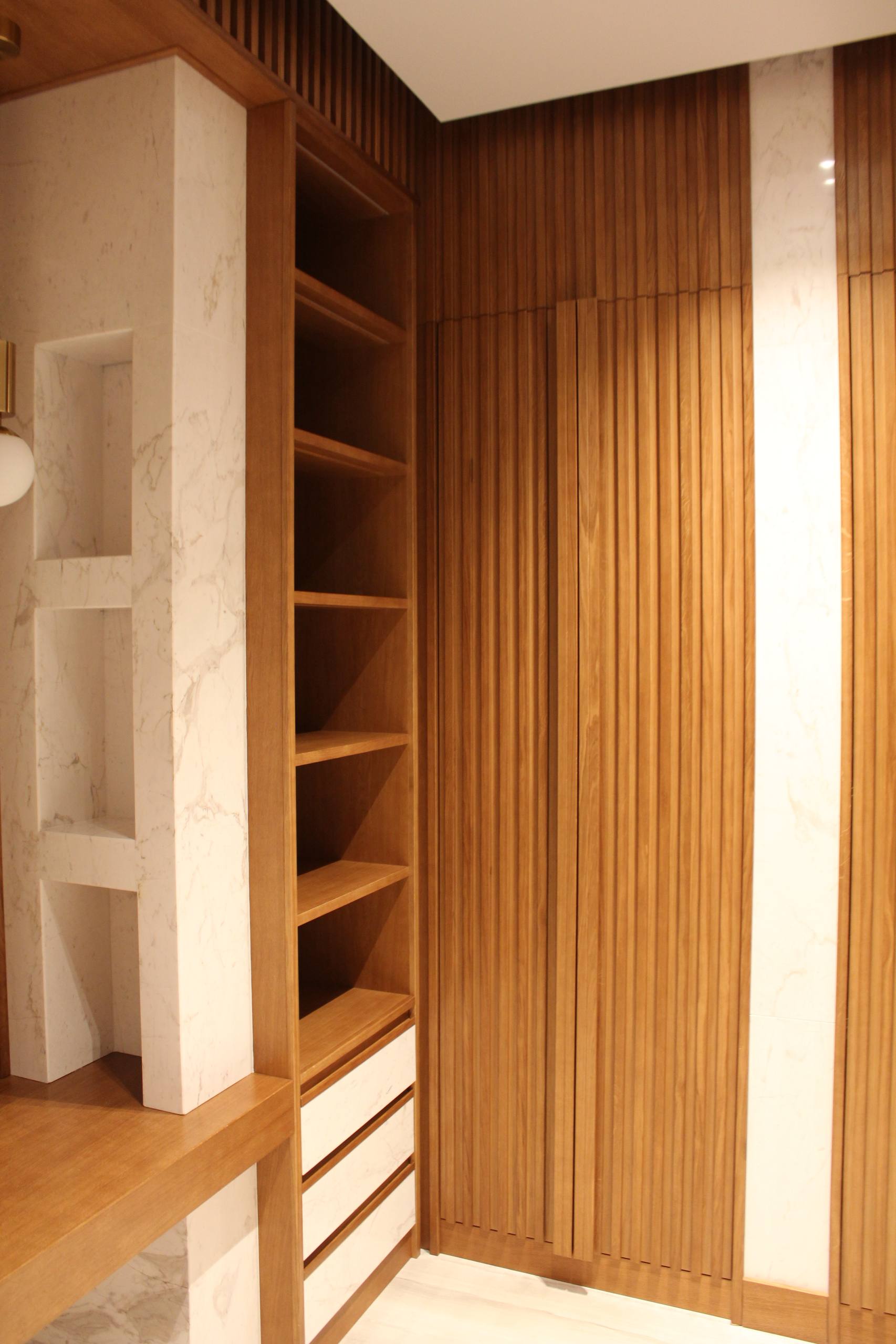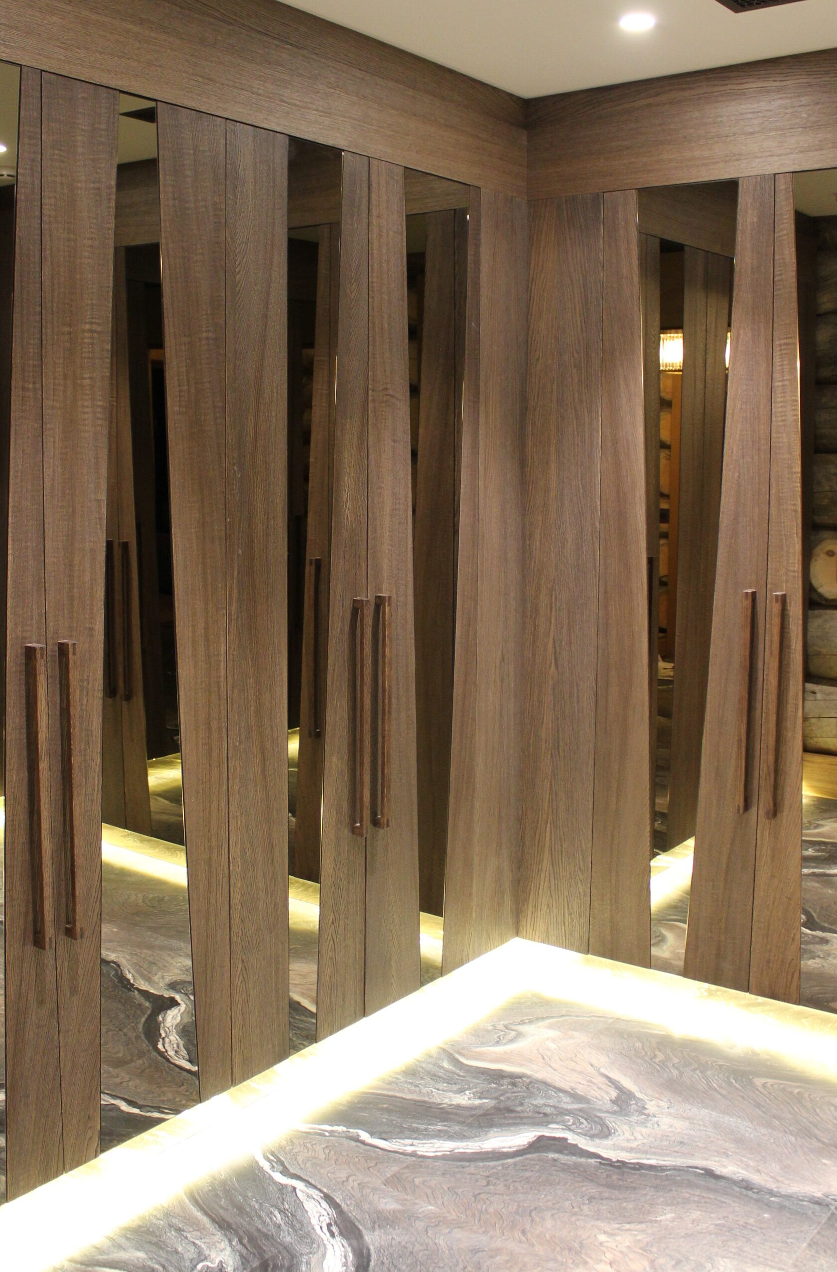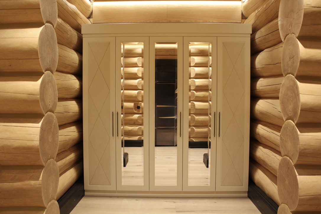 Для гардеробных мы используем дерево дуба, ореха, лиственницы, бука, ясеня, кедра и тика и применяем элементы натурального массива для придания уникальных форм повышенной сложности на фасадах шкафов.
